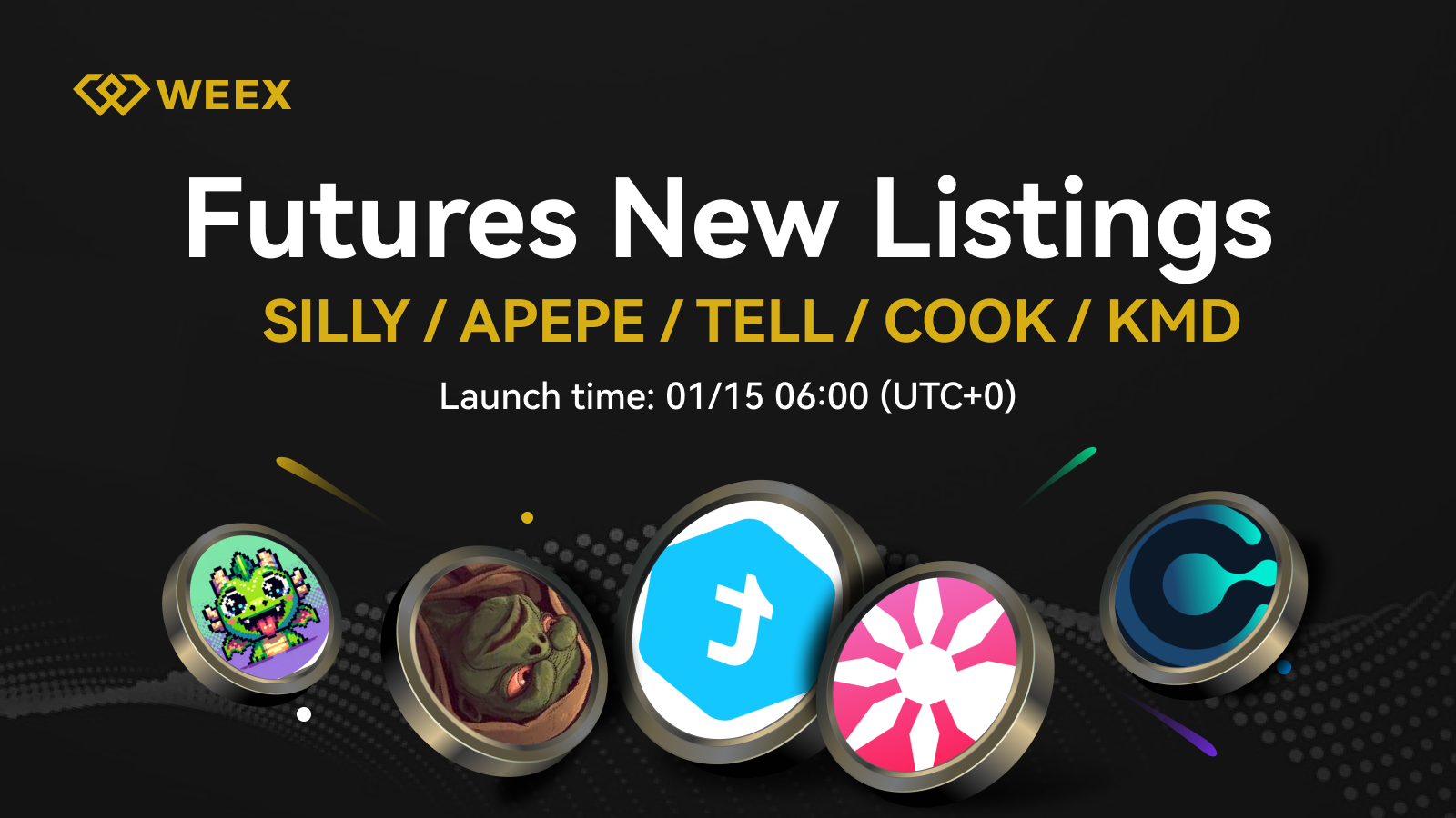 WEEX Futures will launch SILLY / APEPE / TELL / COOK / KMD perpetual futures trading pairs at 1/15 6:00 UTC+0 . These futures are denominated in USDT and offer various leverage to meet the needs of different investors.