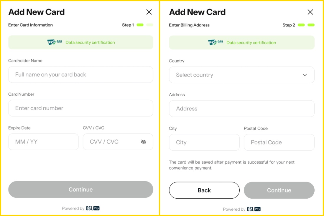 Step 4: Enter the required details and select "Continue" to finish card linking. Skip this if not using a credit card.