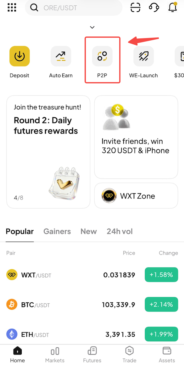 - Log in to the WEEX website → Navigation bar → Buy Crypto → P2P Trading