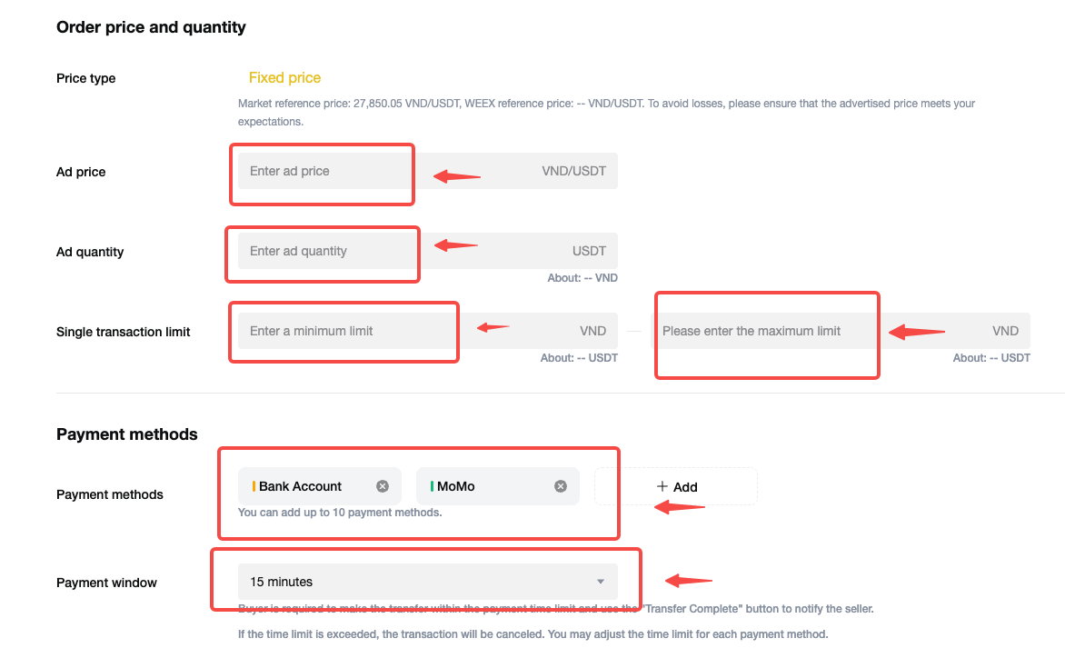 - Set trade details: Set the ad price, quantity amount, limits, and payment methods.