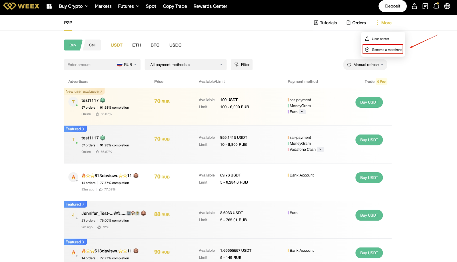 To ensure a high-quality trading experience for users, WEEX accepts merchant applications only from professional traders with certain trading experience and liquidity.