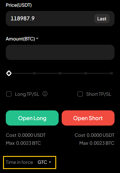 Good Till Cancel (GTC): The order will remain valid until it is fully executed or manually canceled by the trader. GTC is suitable for traders who are willing to wait for all contracts to be completed at a specified price and can flexibly cancel unconcluded contracts at any time.