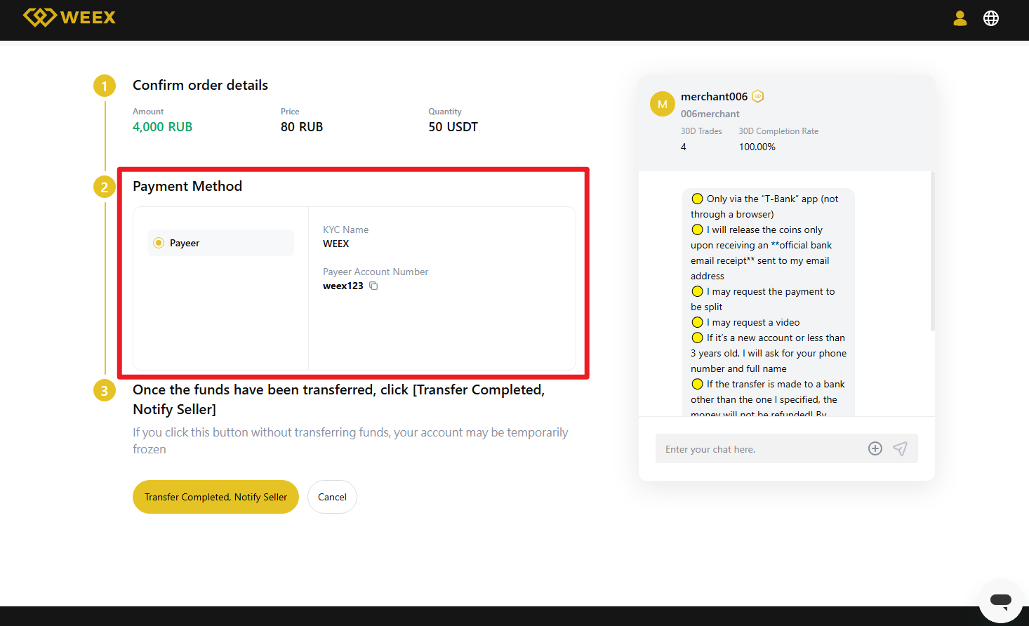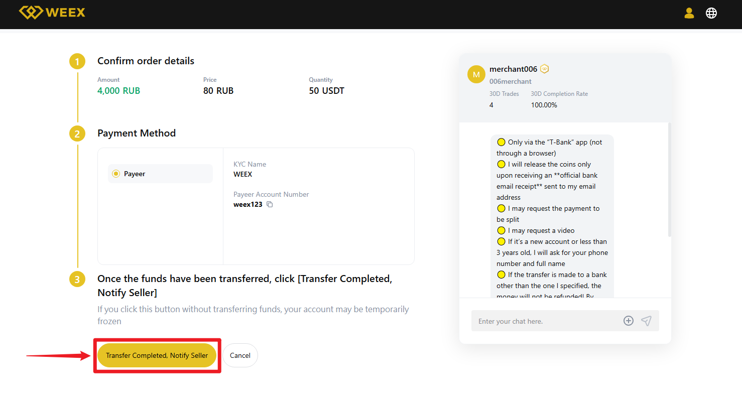 - Ödeme notlarında "kripto para birimi", "BTC", "P2P" veya "WEEX" gibi hassas kelimeleri kullanmaktan kaçının.