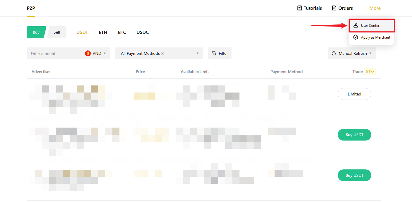 - "P2P yönetimi" sayfasına gidin: Sağ üst köşedeki "Daha fazla" (üç nokta simgesi) seçeneğine tıklayın, ardından "Kullanıcı Merkezi" seçeneğini seçin.