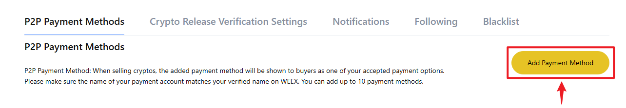 - "P2P Ödeme Yöntemleri" altında, "Ödeme Yöntemi Ekle" düğmesini seçin.
