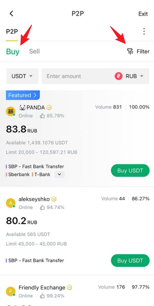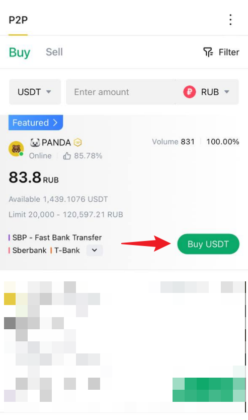 - P2P sayfasında, "Alış" sekmesine tıklayın ve USDT, BTC vb. gibi satın almak istediğiniz kripto para birimini seçin.