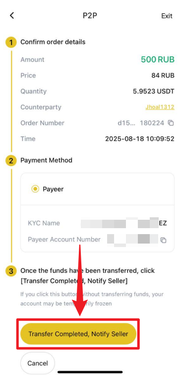 - Ödemeyi tamamladıktan sonra emir sayfasına geri dönün ve "Transfer Tamamlandı" seçeneğine tıklayın.