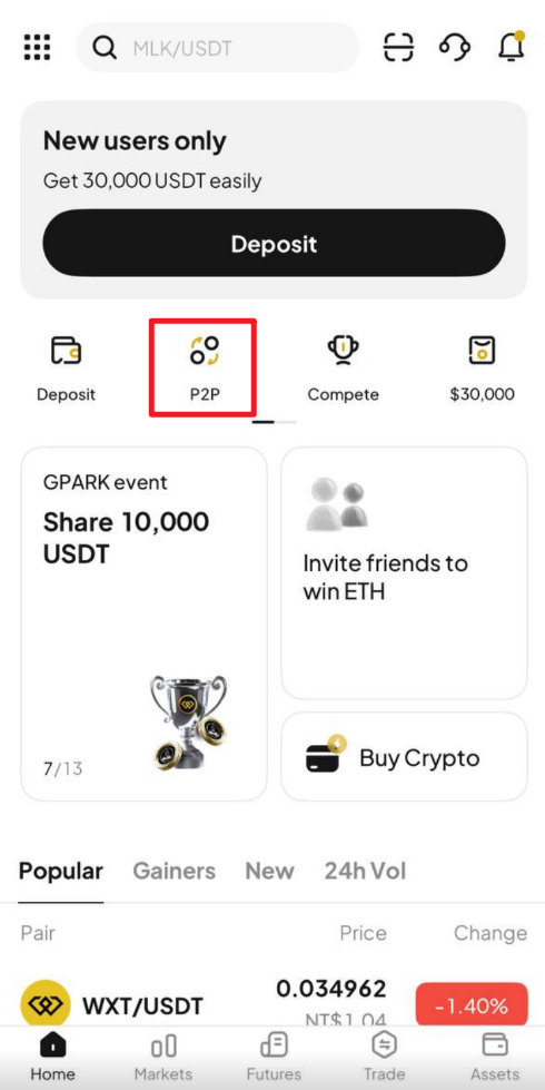 WEEX Uygulamasında, ön sayfadaki "P2P" seçeneğine tıklayın.