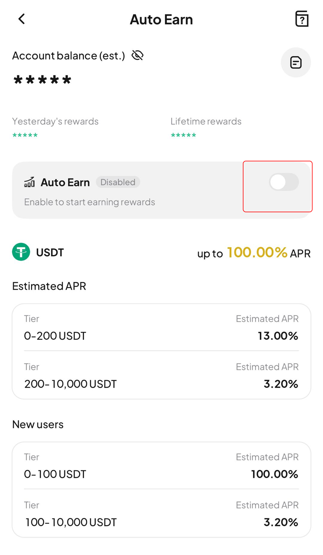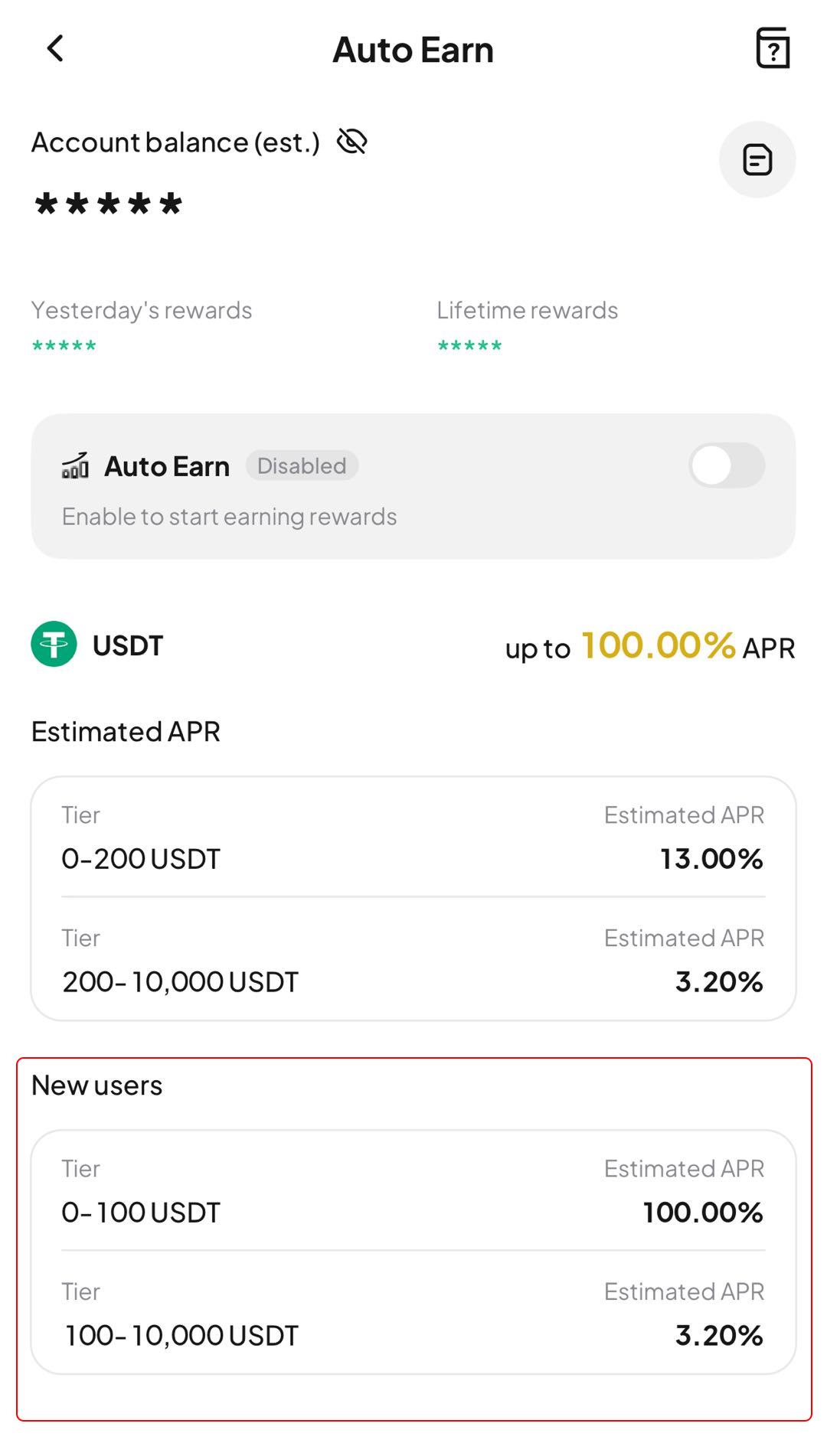 2. KYC onayından sonraki 7 gün içerisinde Otomatik Kazanç özelliğini etkinleştiren kullanıcılar, özel yeni kullanıcı APR'ından yararlanabilirler. 7 günden sonra normal oran uygulanır.