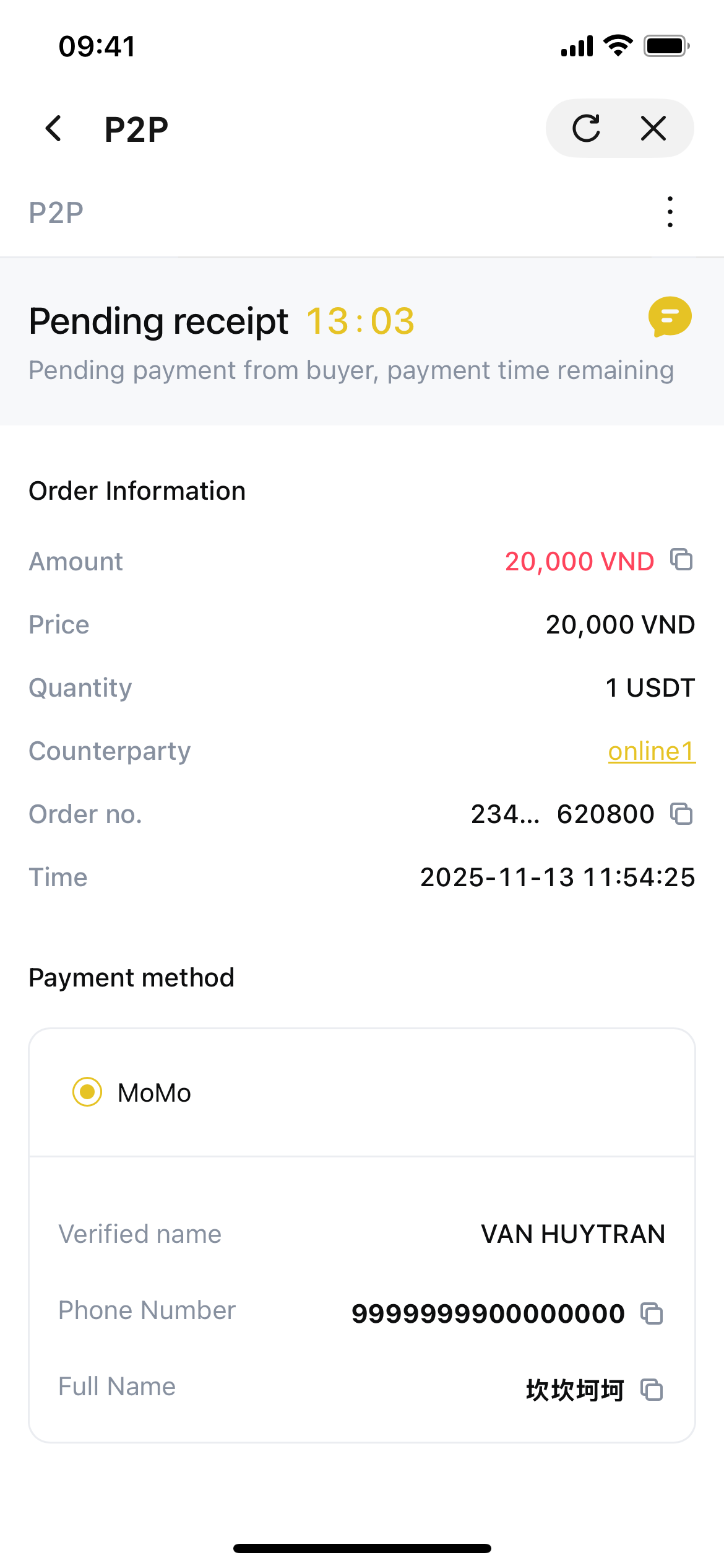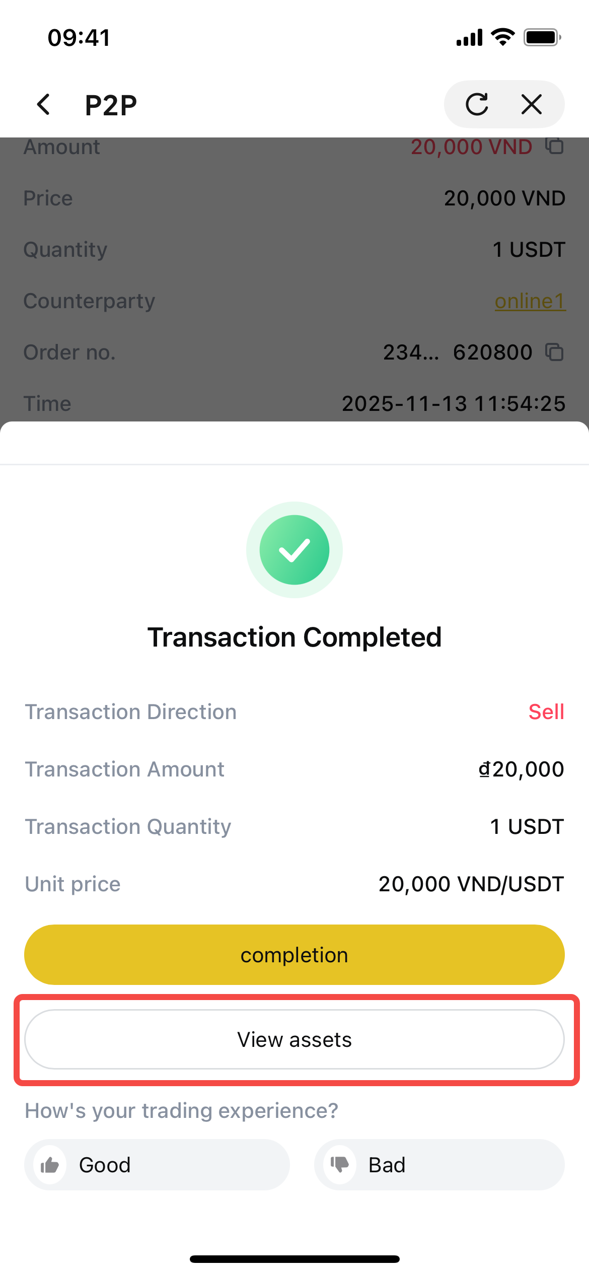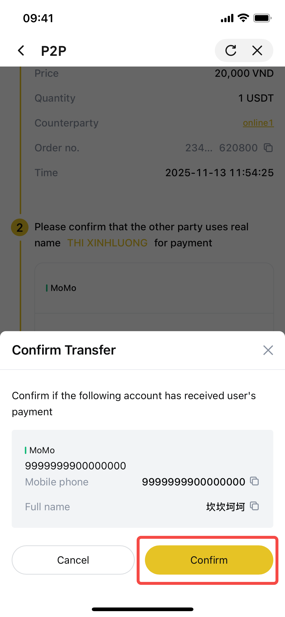 - Alıcı ödemeyi yapmış olarak işaretledikten sonra, fiat tutarının alındığını onaylamak için banka uygulamanıza giriş yapın.