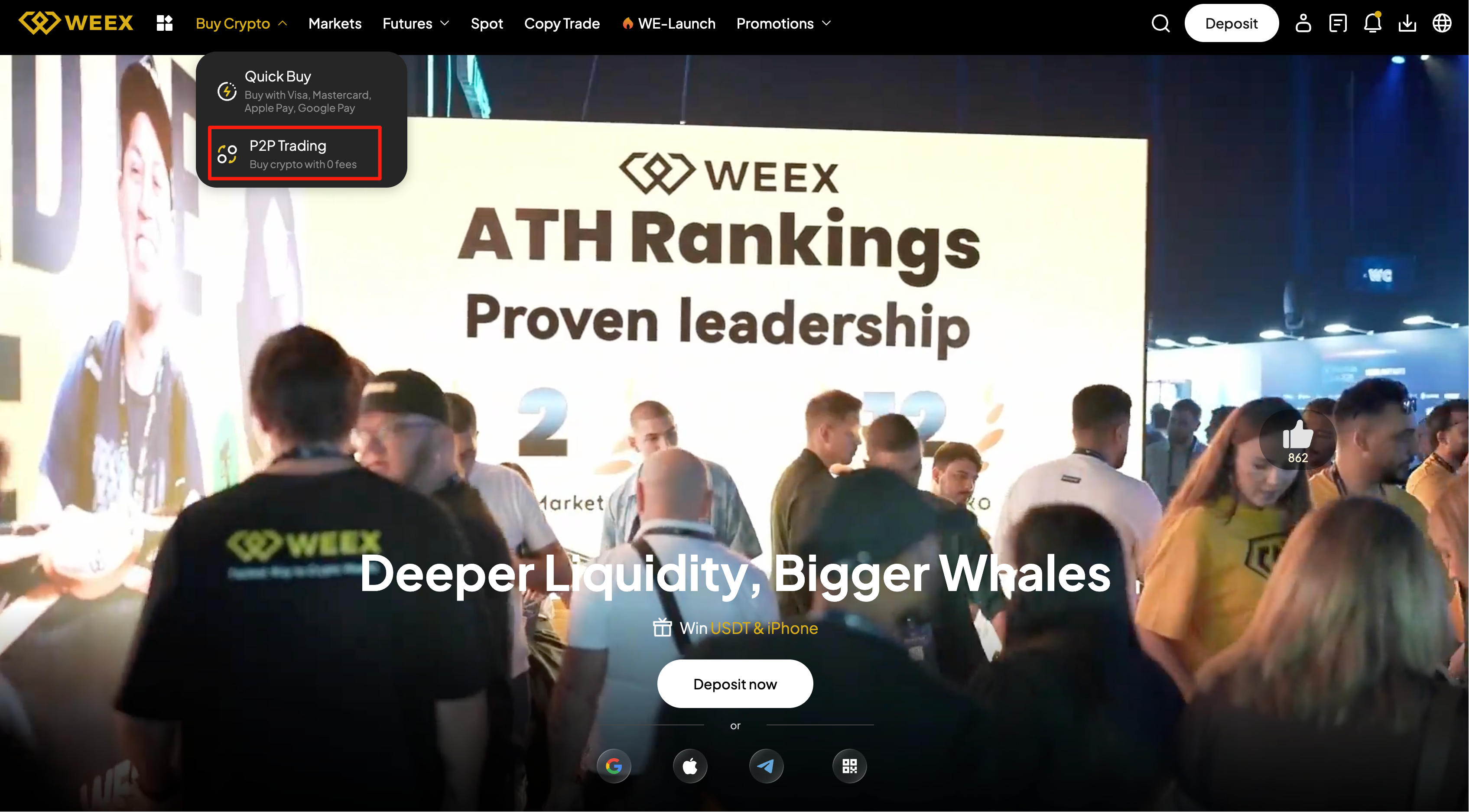 WEEX web sitesinde, gezinme çubuğundaki "Kripto Satın Al" üzerine gelin, ardından sayfaya girmek için "P2P Ticareti"'ne tıklayın.